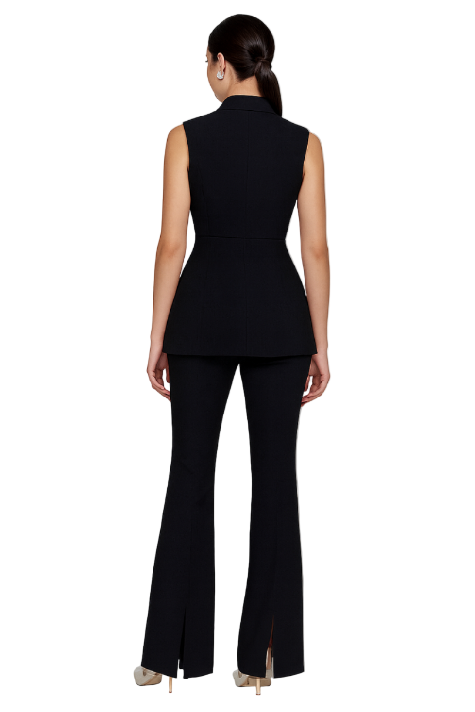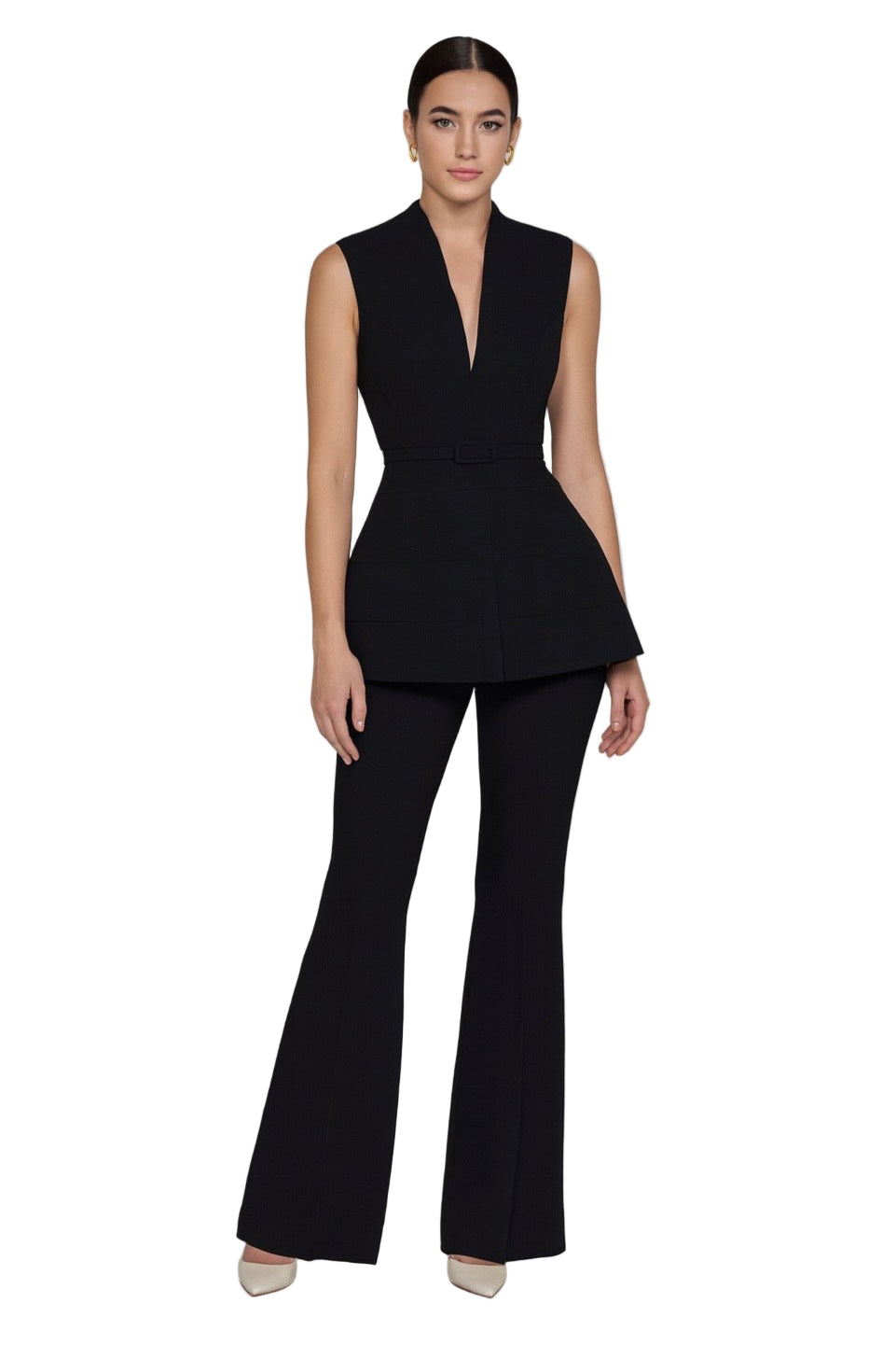 The Amber Set features a V-neckline top defined at the waist with a sleek belt to accentuate your silhouette. It is paired with high-waisted flared trousers.