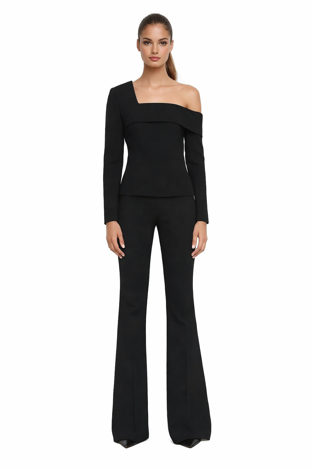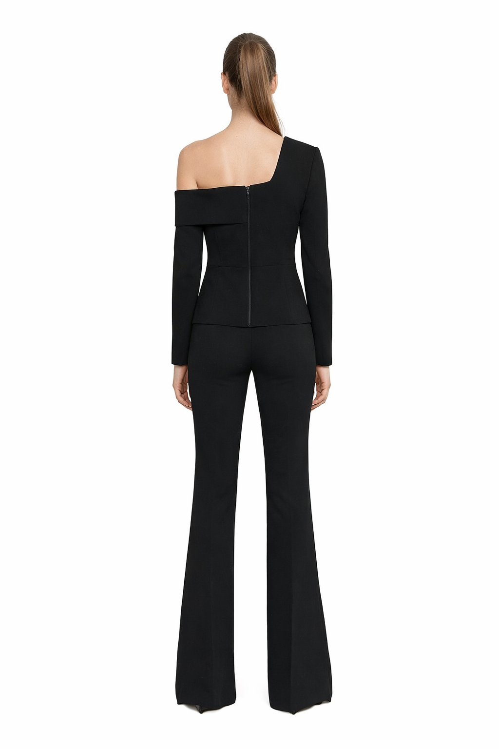 The Aurora Set features a one-shoulder blazer paired with high-waisted, flared trousers—designed to reflect modern grace and understated glamour.