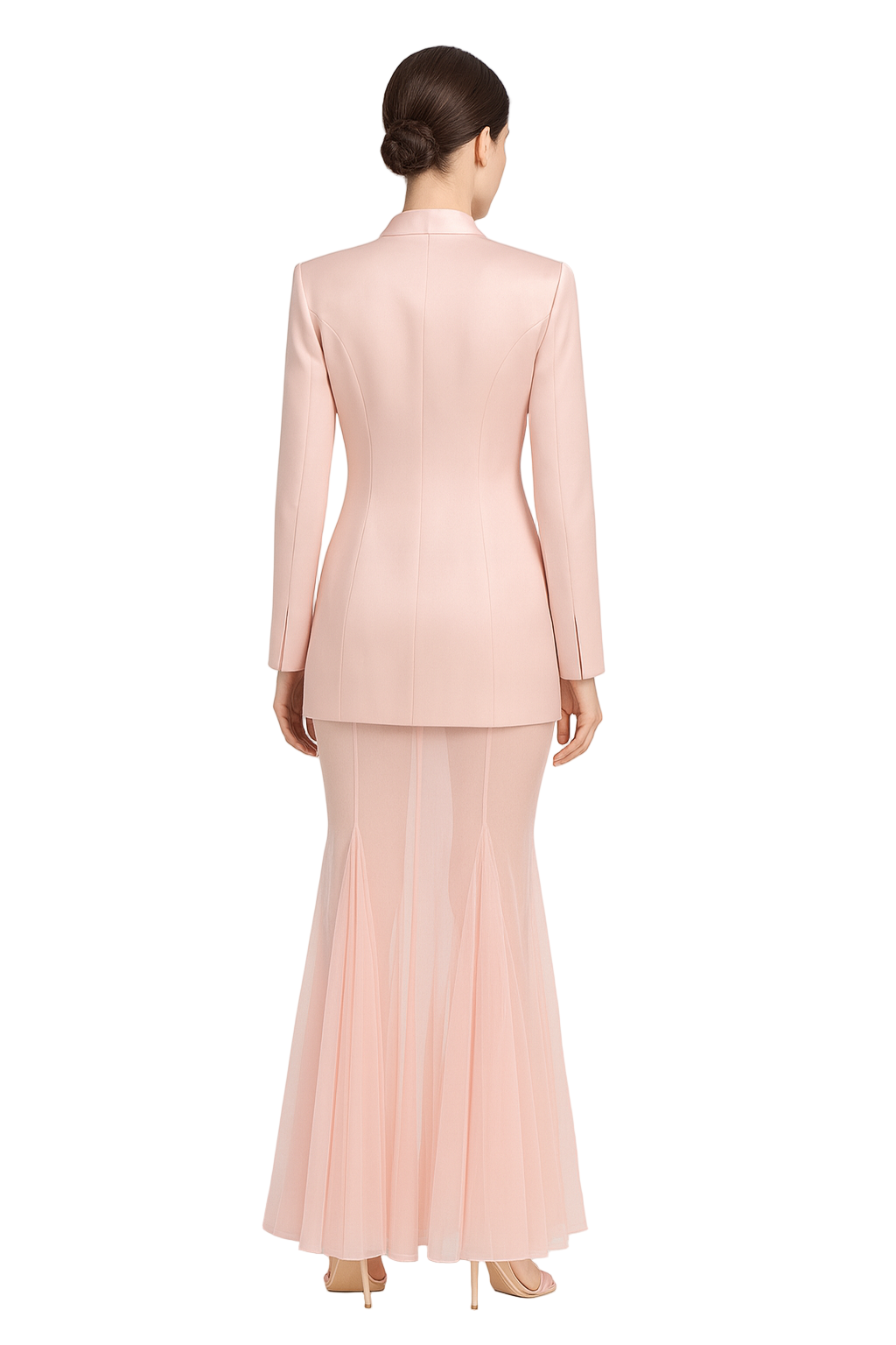 The Beline Set features a tailored blazer paired with a sheer mermaid skirt—offering a dreamy aesthetic that leaves a lasting impression.