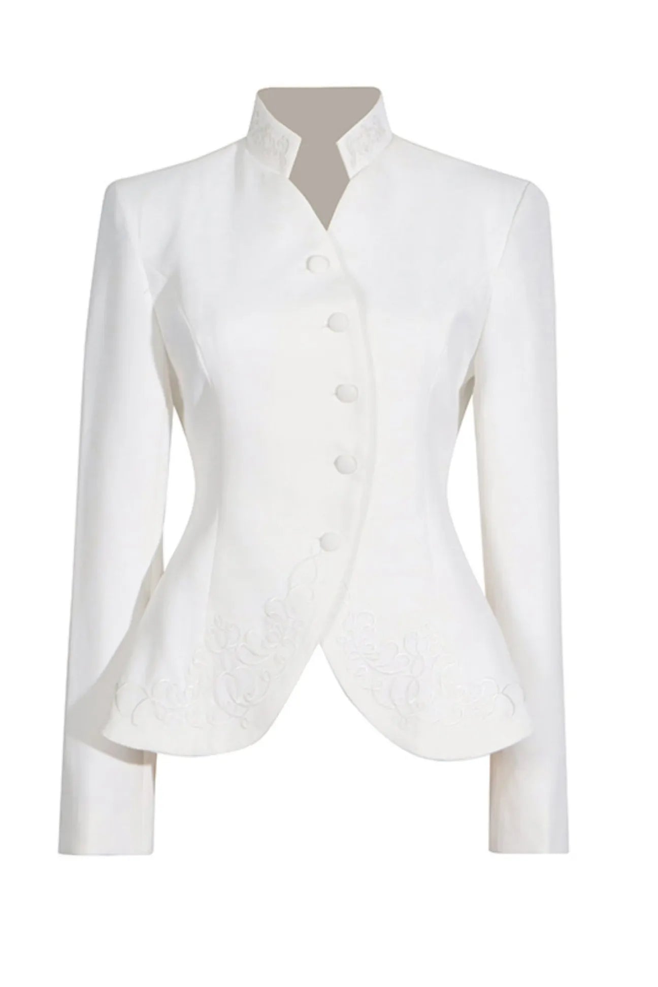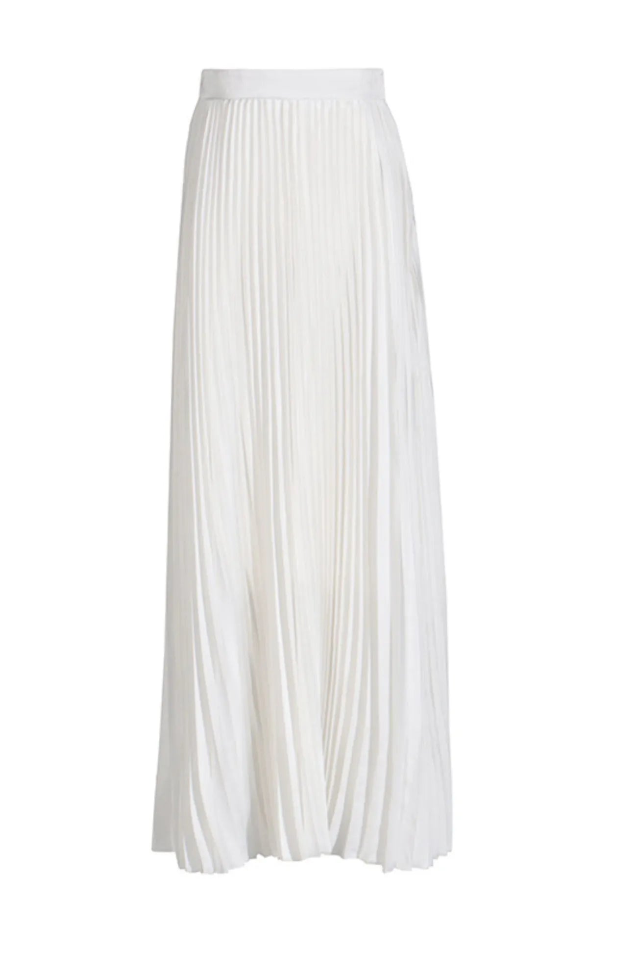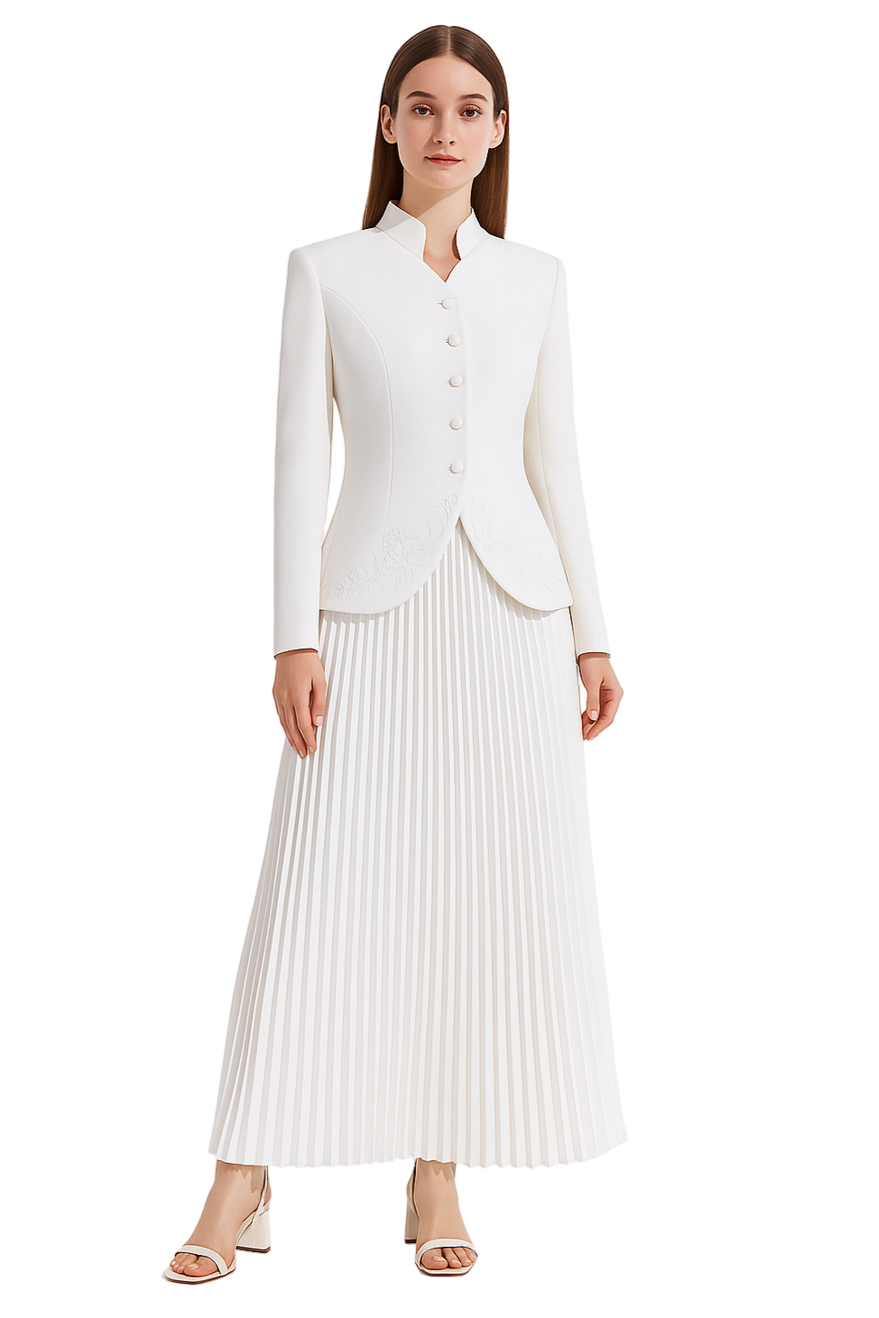 The Reina Set features a tailored blazer paired with a flowing pleated skirt—combining timeless sophistication with modern elegance.