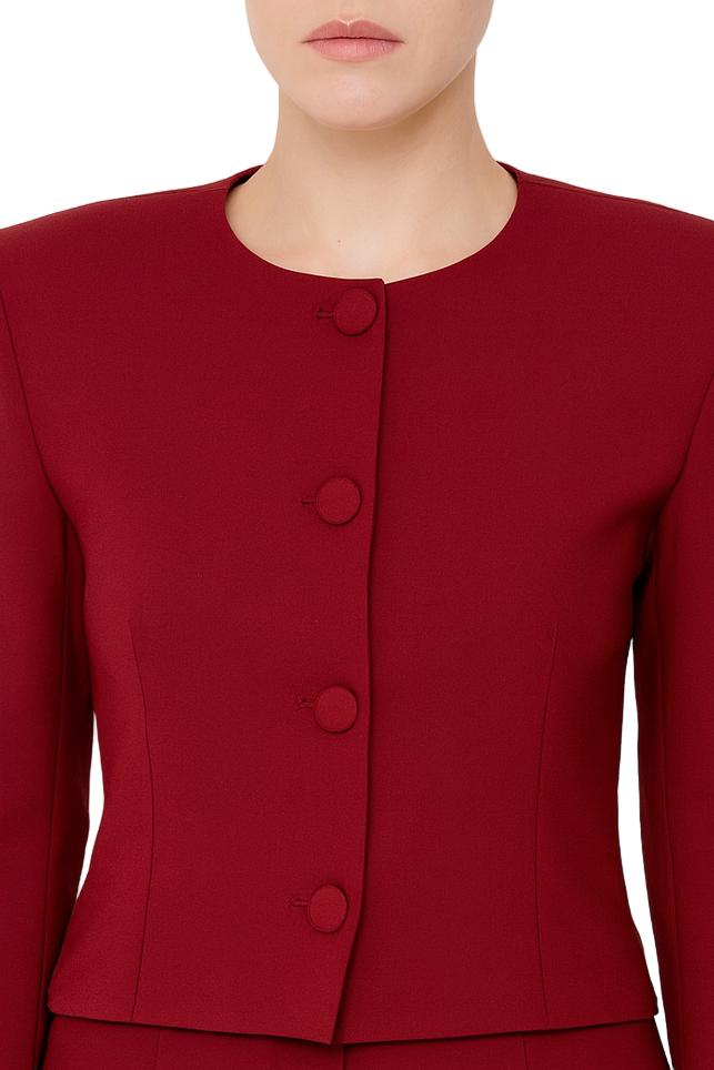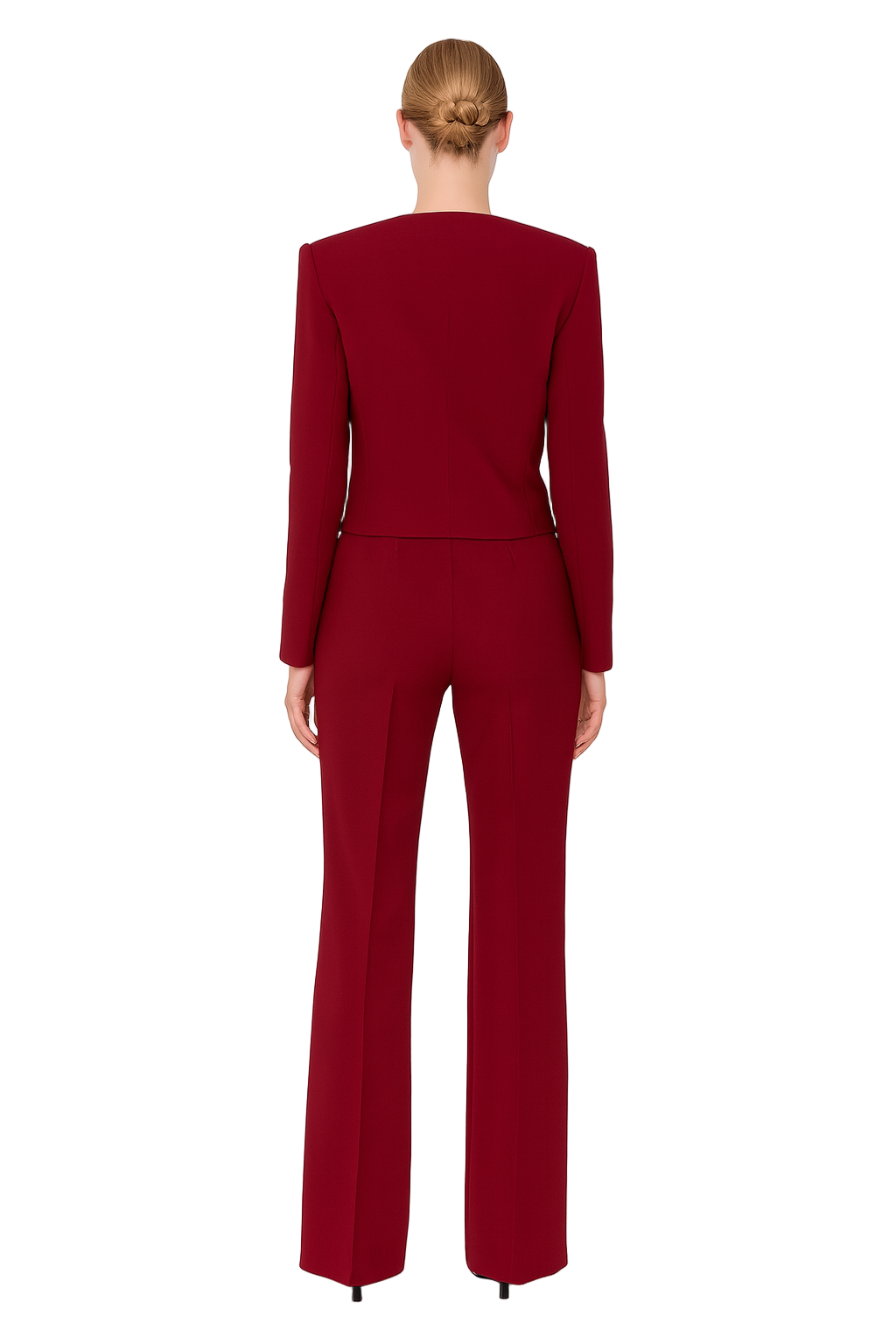 The Ruby Set features a tailored cropped blazer paired with high-waisted, flared trousers—an ensemble that defines timeless elegance and refined femininity.